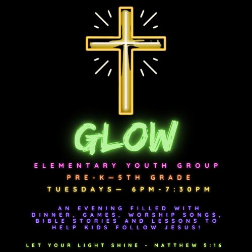 "Glow" is our group for kids age Pre-K to 5th grade. We meet on Tuesday evenings from 6-7:30 pm. This evening includes dinner, games, worship songs, Bible stories and lessons to help kids learn to follow Jesus! After June 10th we'll be taking a break for the summer and will resume meeting in August.